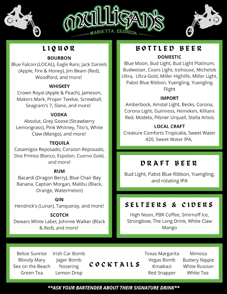 The drink selection includes both classic and contemporary options, from draft beers like Bud Light to a thoughtful range of seltzers and ciders including High Noon, Strongbow, and White Claw. For those looking to unwind or celebrate, Mulligans serves mixed drinks and cocktails with familiar favorites like Jack Daniels, Irish Car Bombs, and vibrant choices like the Texas Margarita or Sex on the Beach.